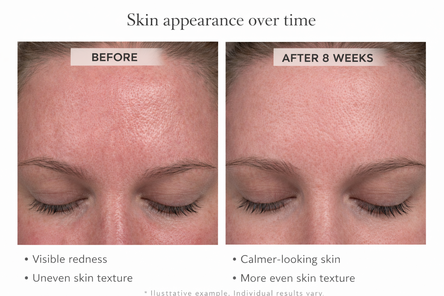 My skin was often red and reactive, especially on my forehead. After completing the skin analysis and following the recommended routine consistently, my skin looks calmer and more balanced overall. -